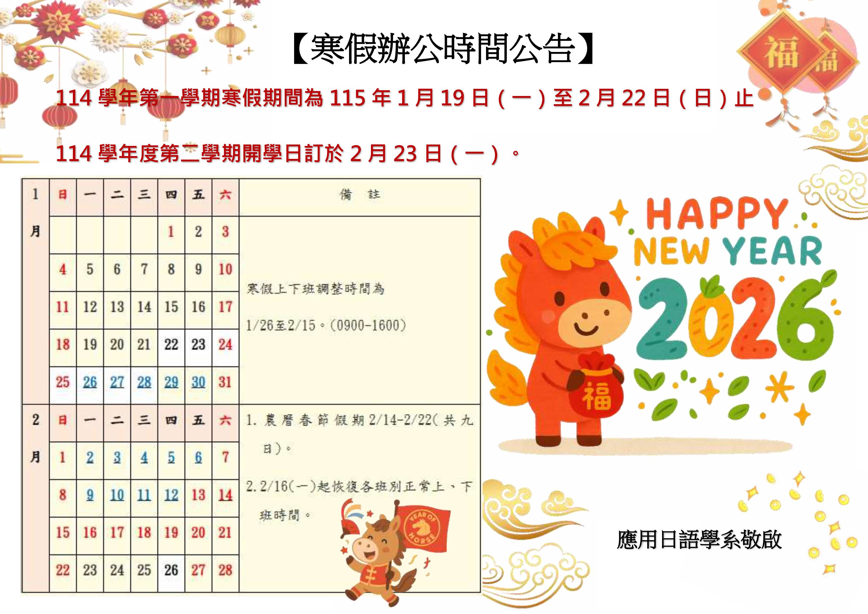 【重要】114學年寒假全休日及上、下班時間調整公告(置頂)